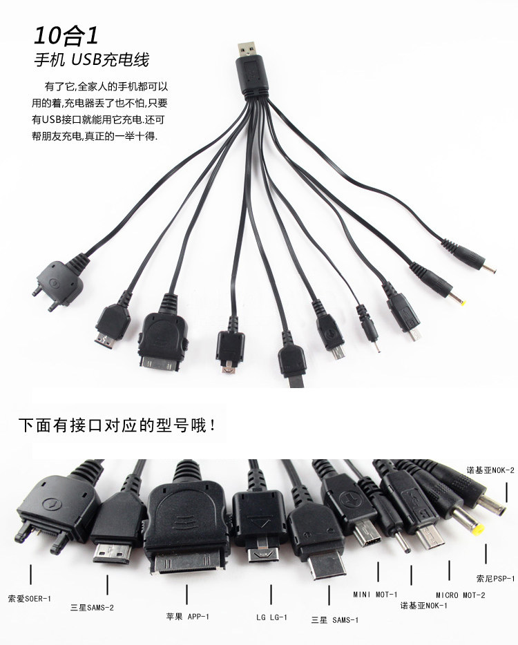 The ten in one USB charging cable? general nowadays popular mobile phone jack? such as V3? Mike 5P? apple export etc.