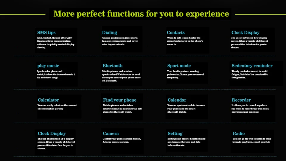 Function:Passometer,Sleep Tracker,Big Three Needles,Small Second,Calculators,Permanent Calendar,24 hour instruction,Message Reminder,Calendar,Dial Call,Power Reserve,Alarm Clock,Remote Control,Month,Answer Call,Week,Call Reminder