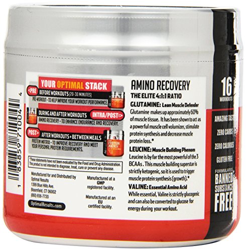 ReleaseDate : 2015-06-12 Studio : Optimal Results Publisher : Optimal Results Binding : Health and Beauty Product Description Optimal Results Amino Recovery, the elite 4:1:1 recovery ratio. Glutamine: Clinical Dose 2.5 gram to 5 gram. Glutamine makes up approximately 60% of muscle tissue. It has been shown to act as a powerful muscle cell volumizer, stimulate protein synthesis and decrease muscle protein loss. Leucine: The Muscle Building Phenom. Leucine is by far the most powerful of the 3 BCAA's as it cannot convert to energy. This muscle building superstar is strictly ketogenic, so it is used to trigger muscle protein synthesis (growth). Valine: Essential Amino Acid. Valine while essential, is strictly glucogenic and can also be converted to glucose for energy during your workout. 0