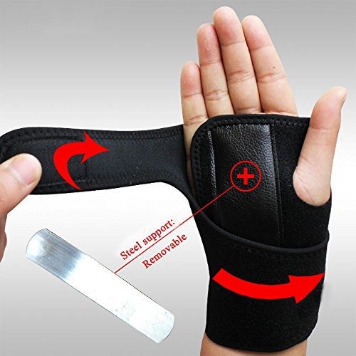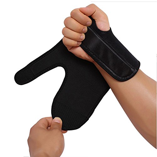 -. Feature : ONE SIZE FIT ALL This adult Wrist Brace thumb stabilizer goes with a standard size, which is suitable for all kinds of sports enthusiasts, men and women, including those who are suffering the thumb pain or carpal tunnel. / THUMB STABILIZER Due to the regular activities of the thumb, it is quite easy to cause friction to the wrist tendon sheath, and thus result a tendonitis or carpal tunnel. This finger brace is a great finger support to deal with this symptom through stabilizing the thumb and preventing the repeated friction on wrist tendon sheath. Sportsman with the thumb brace will not feel thumb pain any more once the tendonitis tissue get a recovery. / STEEL SUPPORT BRACER Provides the highest level of comfort with a high level of wrist support, Helps relieve pain and swelling while maintaining full range of movement of thumb and fingers / With Velcro can be freely adjusted according to individual needs,Fits even the most slender wrist and hands.Non-slip design and velcro high-sticky with long life, not easy to fall off / MULTI SPORTS GEAR This thumb and wrist support is widely used as finger support in all kinds of sports activities, such as basketball, volleyball, boating, badminton, weightlifting, table tennis, climbing, biking, cycling. It effectively plays a role of stabilizing user's the thumb and preventing the repeated friction on wrist tendon sheath during these sports activities, make users to enjoy the sports more safely.