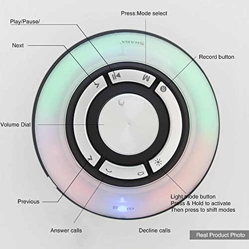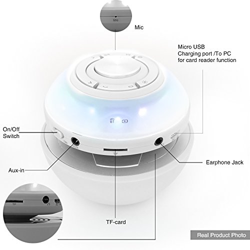 All in 1: wireless Bluetooth connection, hands free speakerphone, Micro SD/ TF card playing, Auxiliary connection, FM radio, Recorder, recorded tracks playback, headphone output and multi-color LED light show.