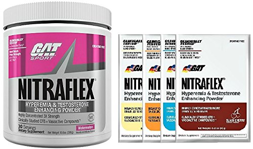 -. Binding : Health and Beauty -. Brand : GAT -. EAN : 0640864839455 -. Feature : Clinically tested, High-Intensity Training Formula / Creatine Free / Highest Concentration (More than 3x Strength) / Boost Testosterone / With 4 Single Serving Packs(Flavor May Vary) -. IsAdultProduct : 0 -. Label : GAT -. Manufacturer : GAT -. PackageQuantity : 5 -. ProductGroup : Health and Beauty -. ProductTypeName : HEALTH_PERSONAL_CARE -. Publisher : GAT -. Studio : GAT -. Title : GAT Nitraflex,Testosterone Enhancing Pre Workout 30/S W/Single Serving Packets (Fruit Punch) -. UPC : 640864839455