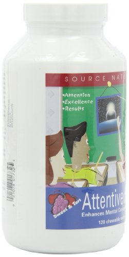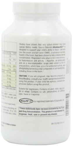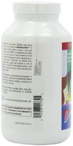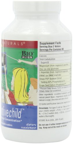 Dietary supplement. Attention. Excellence. Results. Bio align. Enhances mental concentration. Dietary supplement. Studies have shown that very active children may have special dietary needs. Source Naturals Attentive child is designed to support your child's ability to focus - and kids love the sweet and tart taste! DMAE, a substance normally found in the brain, has been shown to help enhance mental concentration. Magnesium also plays a role in neuromuscular transmission and activity L-Aspartate, an amino acid, acts as a neurotransmitter. Grape seed extract is rich in procyanidins, which have powerful antioxidant activity and phosphatidylserine is a vital component of cell membranes, including those in the brain. Contains no yeast, dairy, egg, gluten, or wheat. Contains no salt, preservatives, or artificial color, flavor or fragrance. (These statements have not been evaluated by the Food and Drug Administration. This product is not intended to diagnose, treat, cure or prevent any disease).Feature