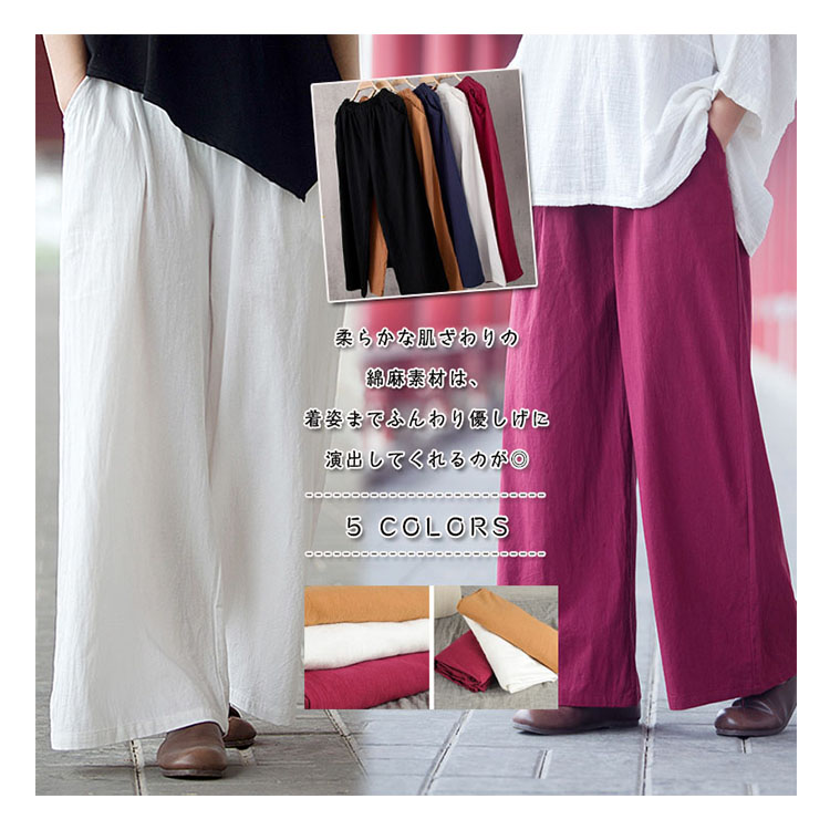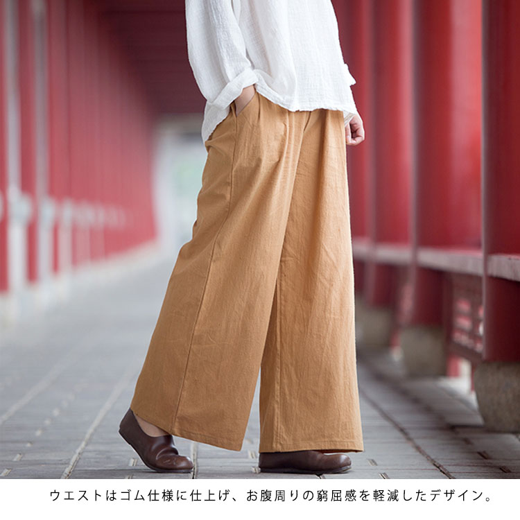 | 柔らかな肌ざわりの綿麻素材は、着姿までふんわり優しげに演出してくれるのが◎気負わず着られる軽い着心地も魅力のひとつです。ウエストはゴム仕様に仕上げ、お腹周りの窮屈感を軽減したデザイン。 毎日の着こなしを彩る、ナチュラルな主役級ガウチョをぜひお試しくださいませ。 | |
