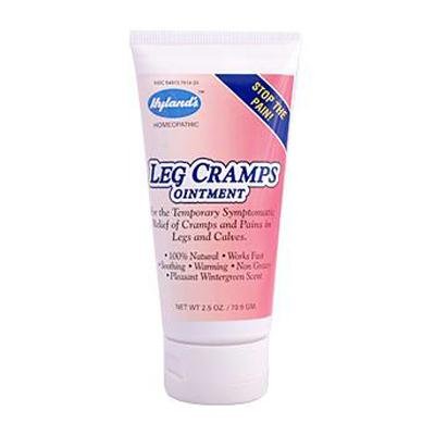 -. Feature : Hyland's® Leg Cramp Ointment / Tried and true remedy for leg cramps, with homeopathic quinine (Cinchona Off 3X), also brings pain relief from: foot & calf cramps, joint stiffness, pain in lower back and sciatica. / Leg cramps ointment works quickly to relieve cramps and pains while warming the area. / 100% natural, non-greasy, with a pleasant wintergreen scent. / 2.5 Oz. bottle.