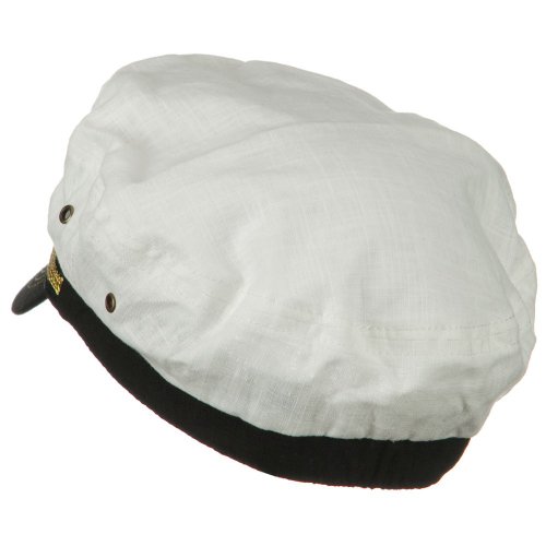 -. Binding : Apparel -. Brand : MG -. Department : mens -. Feature : Made of 60% linen and 40% cotton. / S, M and L sizes are available. / Crown measures 3 inches deep, with decoratin band. / Bill measures 2 inches long, pre curved with gold stitches. / Soft and thick material. -. ProductGroup : Apparel -. ProductTypeName : ACCESSORY -. Title : Linen Captain Hat - White Black W35S42D