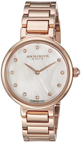 -. Binding : Watch -. Brand : Akribos XXIV -. Color : Rose/Gold -. Department : womens -. EAN : 0848572072427 -. Feature : White genuine mother-of-pearl dial with two hand movement / Diamond hour markers with rose gold tone leaf style hour and minute hands / Polished rose gold tone stainless steel with polished rose gold tone link bracelet / Quartz movement with analog display / Water-resistant to 30 M (100 feet) -. Label : TWI Watches, LLC -. Manufacturer : TWI Watches, LLC -. Model : AK877RG -. MPN : AK877RG -. PackageQuantity : 1 -. PartNumber : AK877RG -. ProductGroup : Watch -. ProductTypeName : WATCH -. Publisher : TWI Watches, LLC -. Studio : TWI Watches, LLC -. Title : Akribos XXIV Women's AK877RG Round White Mother of Pearl Dial Two Hand Quartz Rose Gold Tone Bracelet Watch -. UPC : 848572072427