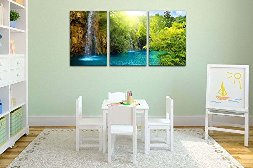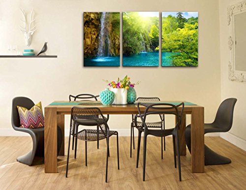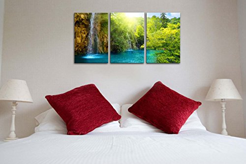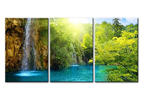 -. Title : Canvas Print Wall Art Painting For Home Decor Waterfall In Dawn With Sunrise Blue Lake Green Trees And The Golden Sun Rays Through The Forest 3 Pieces Panel Paintings Modern Giclee Stretched And Framed Artwork The Picture For Living Room Decoration Landscape Pictures Photo Prints On Canvas