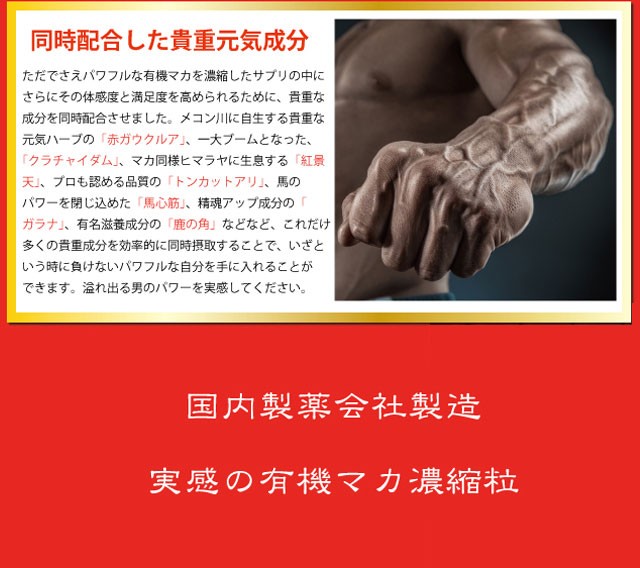 | 商品説明 | 勝負時の必須アイテム! アンデスの秘宝と呼ばれる貴重な健康素材「マカ」 有機JASマカを135,000mg濃縮配合! |