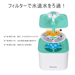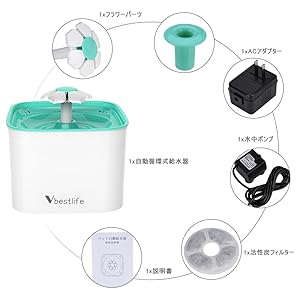 【キレイな水でいつもイキイキ】 循環式給水器は水を流せ、流れる水にワンチャン、ネコちゃんは興味を示し、飲水量アップに貢献します。花状の滝作りは取り付けできます。犬が飲みやすい、水溜りスペースや猫が飲みやすい、流れ水を簡単に変更できます。 【2層過瀘、活性炭フィルター付き】 給水器の蓋層は異物混入を防げます、フィルターをつまりません。フィルター交換可能な活性炭フィルターは水道水を常に軟水化し、皮毛、食べ残し、ほこりを取り除き、除臭機能があり、ペットの健康に役に立ちます。 【静音ポンプ】 ペット給水器のポンプは12Vの低電圧ポンプを使用、150L/hの穏定水量を提供できます。省エネながら性能がよい。工作音量は45dB以下、図書館内ほどの音量で夜でも騒ぎません。一日中つけっぱなしにしても大丈夫で、ペットはいつでも美味しくきれいな水を飲めます。 【2L大容量】 給水器は約2Lの容量があります。小型ペットはもちろん、ハスキーやアラスカンなど大型犬の飲水量を保証できます。 【パッケージ内容と品質保証】 ペット用給水器*1;ポンプ*1;活性炭フィルター*1;アダプター*1;弊店の製品は3ヶ月の安心保証付き、何か問題がございましたら、お気軽にご連絡ください。