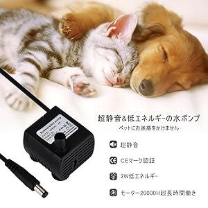 ペット給水器のポンプの工作音量は45dB以下、図書館内ほどの音量で夜でも騒ぎません。