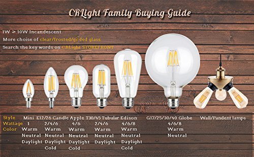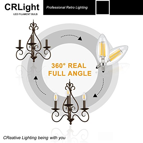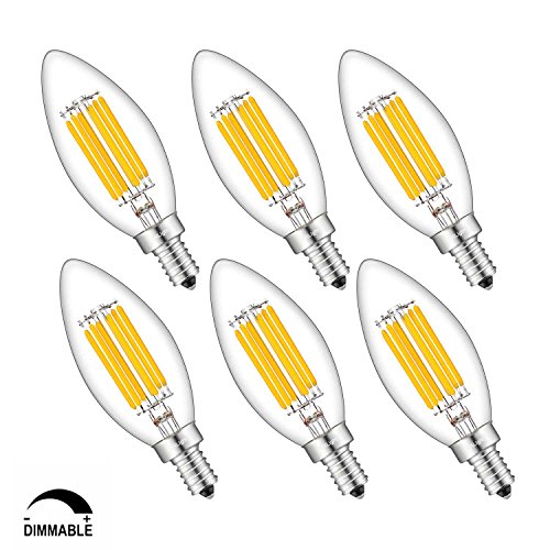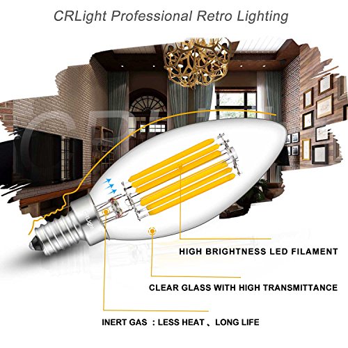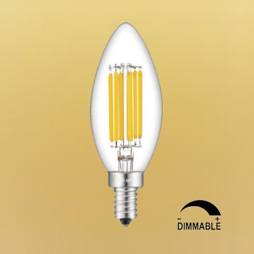 Product Type: B11 6W Dimmable LED Filament Candle E12 Candelabra Base 2700K(6-Pack) Base Type: E12 Shape Type: Torpedo Shape Bullet Top Working Voltage: AC 110V-130V Color Temperature: 2700K (Warm White) Incandescent Equivalent: 60W Luminous Intensity: 700LM Beam Angle: 360 Degrees Size: Diameter 1.38 Inch x Height 3.9 Inch Material: Metal and High-Strength Glass Light Source: 6 COB-LED Life Span: Average 30000 Hours Lifespan,16 Years Life (5 Hours per Day) Mercury-free,No UV,No Hum,No Flickering,CE and RoHS Authenticate Please Note: 1.Most traditional incandescent or CFL bulbs dimmer can not be used for LED bulbs dimming,and some poor quality dimmer may cause flicker or not-working,to dimming these LED bulbs,please upgrade your dimmer switches/lamps to support LED bulbs. 2.In LED industry,there is no unified technical specification, different bulbs and LED dimmers usually are designed by different technology,so some kinds of LED dimmer are not compatible with CRLight's DIMMABLE LED bulbs,especially smart dimmers and switches. 3.CRLight recommended dimmer brand is Lutron: ★ - Lutron DVCL-153P-WH Diva ★ - Lutron DVELV-300P-WH Diva 0