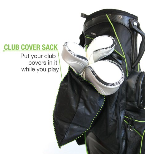 - Feature : Made with Hydro X weather and dirt-resistant fabric / 10" top, 14-way individual full length dividers top with ergonomic handle/Two integrated putter wells/8 zippered pockets / Spacious insulated zippered/Air flow dry pocket/Molded hard cover valuables pocket / 14 external tee holder/Club cover pull out sack to store all your club head cover(s) in one place / Rain hood and umbrella holder/Personalized name tag/Weight 6 lbs.