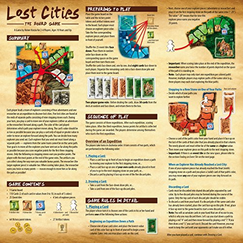 -. Binding : Toy -. Brand : Thames & Kosmos -. EAN : 0814743011618 -. Feature : Adventures to find five forgotten cities / Each player guides a team of explorers on up to five expeditions / Skilled team leaders assess when to play, hold, or discard their cards / Points are awarded based on how far the explorers make it along their paths / The player with the most points at the end of the game wins! -. Genre : strategy -. IsAdultProduct : 0 -. ItemPartNumber : KOS696175 -. Label : Thames & Kosmos -. Manufacturer : Thames & Kosmos -. Model : 696175 -. MPN : 696175 -. PackageQuantity : 1 -. PartNumber : 696175 -. ProductGroup : Toy -. ProductTypeName : TOYS_AND_GAMES -. Publisher : Thames & Kosmos -. Studio : Thames & Kosmos -. Title : Lost Cities - The Board Game -. UPC : 814743011618 -. Warranty : 30 day warranty against manufacturer defects