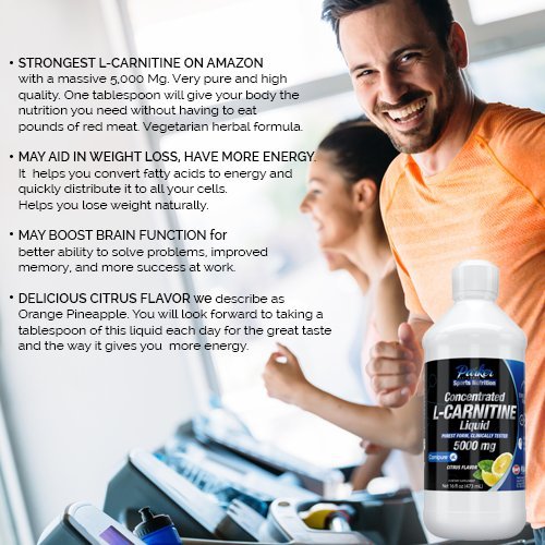 AMAZON'S TOP RATED L-CARNITINE is an impressive 5,000 Mg Dietary Supplement that is the strongest you can get. This formulation is very pure and potent in a big 16 oz bottle. You'll have plenty on hand. Take a tablespoon of premium L-Carnitine each day. This gives your body exactly what it needs to convert fatty acids directly to energy used by the cells. You lose weight and have a lot more energy. This makes you feel better about yourself, more positive about life, better able to function well at work, and fully in the moment for loved ones, family, and friends. GREAT NEW TASTE! Tastes better than other Dietary Supplements. Very nice citrus taste that reminds us of Orange and Pineapple Flavor. You will look forward to taking this each day. Especially when your cellular mitochondria immediately start producing much more energy. No harsh chemicals are used. Made from herbal ingredients that satisfy vegetarian requirements. 100% MONEY BACK GUARANTEE ensures this will be your best bet for a no-risk purchase. Many customers love this supplement so much they return to buy an additional bottle or two. HURRY AND BUY NOW while we have a new shipment in stock. This makes a much appreciated gift for friends, family, and co-workers.Feature