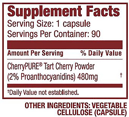 CherryPURE® Tart Montmorency Cherry Capsules are made from the deep red skins of 100% Tart Montmorency cherries. Montmorency cherries are considered a rich source of powerful antioxidants and flavonoids, which promote a host of health benefits including; cardiovascular system health, normal joint function and uric acid levels, regular sleep patterns, and improved muscular strength and recovery. Our Cherry Bay Orchards CherryPURE® capsules have no fillers or artificial additives and contain less than one gram of sugar per capsule. Our proprietary phyto-preserve harvesting technology and freeze-drying process help to protect the efficacy of the nutrients inherent in Tart Montmorency Cherries. Each capsule is one serving and contains 480 mg of Tart Montmorency cherry powder.Feature