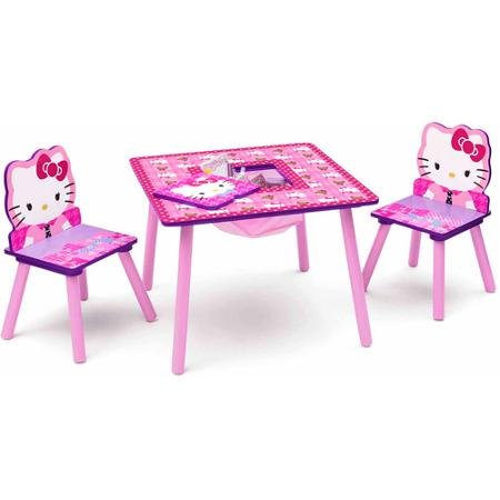 Featuring a spacious tabletop with a toy keep in the middle, this Hello Kitty Table and Chair Set with Storage boasts colorful graphics of girls' favorite feline, along with two coordinating chairs that showcase Hello Kitty's iconic silhouette. Hello Kitty Table and Chair Set with Storage: Age Range: 3 to 6 years Includes 1 table and 2 chairs Assembled dimensions: 24"W x 24"D x 16.50"H Recommended chair weight limit: 50 lbs Colorful graphicsFeature