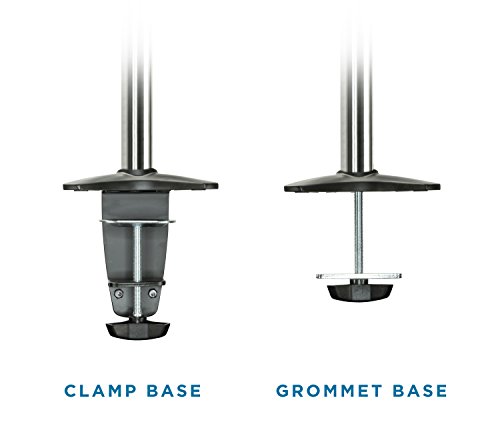 This LCD Monitor arm and pole has durable die-cast Aluminum construction. Its carrying weight limit of 35.2 lbs is one of the highest on Amazon. The base has dual connection function, allowing it to be used either as a grommet base (through a hole on the desk) or as a clamp base to connect it to the edge of the desk. The base can connect to a desk thickness of 0.4 to 3.54.