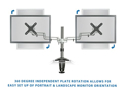 Monitor mounting plate rotates 360 degrees allowing for easy portrait or landscape orientation. You do not need to remove the monitors to change its orientation. Each arm has clips for cable management. The monitor mounts can slide into position on the mount, allowing the monitors to be removed easily without the need to unscrew them from the mount.