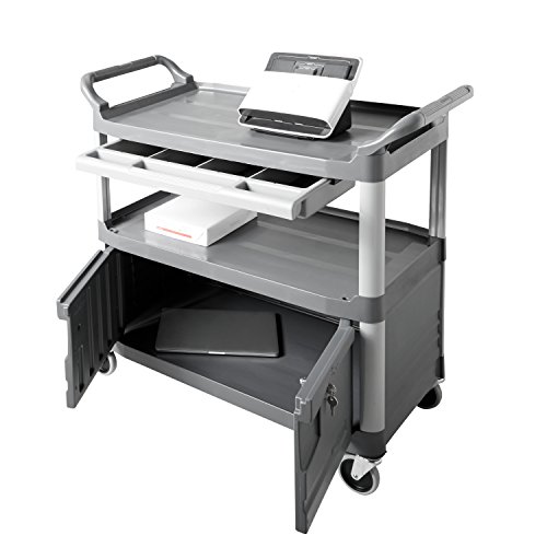 - Title : Rubbermaid Commercial FG409400GRAY XTRA Service and Utility Cart, 3-Shelf with Locking Doors and Sliding Drawer, Gray