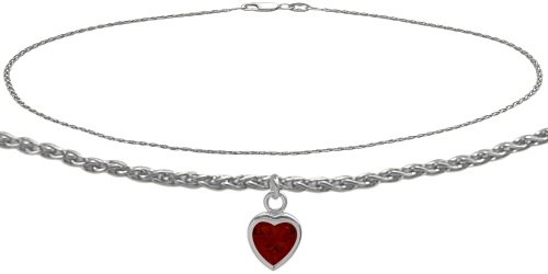 -. Title : 10K White Gold Wheat Anklet with Genuine Garnet Heart Charm