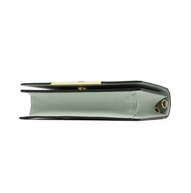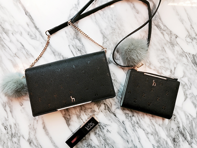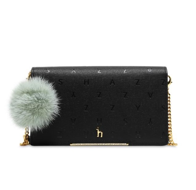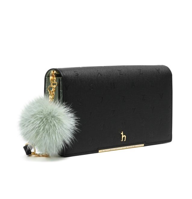 로고 엠보 패턴과 중앙 골드 큐빅바, 탈착가능한 퍼 폼폼 장식으로 포인트를 준 여성스러운 디자인의 클러치 겸용 미니크로스백입니다.