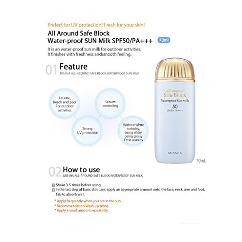 The All Around Safe Block Waterproof Sun Milk provides the best broad-spectrum protection without any greasy residue or white cast. It refreshes the skin n dries to a soft matte finish, perfect under makeup. This Sun Milk is water resistant n stays in place during outdoor activities & watersports, even working against sweat n providing sebum control during those hot months when you need it most.Feature