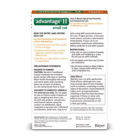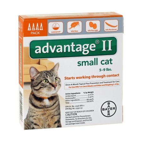 Studio : Advantage Publisher : Advantage Binding : Misc. Product Description Fight the misery of biting fleas with Advantage II! This convenient, easy to apply monthly topical kills fleas through contact, so they don't have to bite your cat to die. Fleas don't just make your cat itchy, they keep biting and hurting again and again. If a flea is ingested it can also cause tapeworms. Advantage II kills adult and immature stages of fleas, thereby effectively breaking the flea life cycle and preventing flea infestations. Since fleas can be brought into your home by you or other pets without even realizing it, it is important to treat indoor pets too. Remember, if your cat has fleas, you have fleas! 0