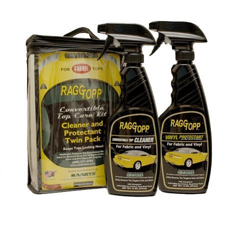 The RaggTopp Vinyl Convertible Top Care Kit contains: 16 oz. RaggTopp Vinyl/Fabric Cleaner pump spray. Use confidently to safely clean convertible tops, sport utility tops, simcon tops and tonneau covers. RaggTopp Cleaner removes the toughest roof soils and stains, retards the growth of mildew and will actually keep dirt and grease at bay. The anti-oxidant, low pH, no bleach formula leaves NO residue. The environmentally friendly & biodegradable formula will not harm automotive finishes, chrome, rubber, glass, or plastic windows. 16 oz. RaggTopp Vinyl Protectant pump spray. Use,RaggTopp Vinyl Protectant on vinyl convertible tops, sport utility tops, car bras, and truck tonneau covers, as well as the rear window on all convertibles. The rear plastic window on your convertible top is a specialized type of clear vinyl called "pressed poly." It contains two layers of non-colored vinyl laminated together under intense pressure and heat. This material is soft and easily scratches, absorbs a wide range of gasses, U.V. rays, liquids, acids and other environmental elements. It will yellow and become brittle in time if you do not maintain it properly. UV protection added in the manufacturing process become less effective each day. RaggTopp Vinyl Protectant will restore the UV protection to the original factory level in order to maintain the look and feel of the vinyl. To use: Rinse top thoroughly to remove loose contaminants. Spray RaggTopp Cleaner evenly over wet surface and scrub lightly with a soft brush or towel. Allow tough stains to soak for 10 to 20 minutes before scrubbing. Rinse top thoroughly and allow to dry completely before applying protectant. Spray RaggTopp Vinyl Protectant onto a dry vinyl top and wipe it dry. Reapply every 3-5 weeks to maintain optimum UV protection. Important Note: Raggtopp Vinyl Protectant is for use on vinyl convertible tops only. Do not use Raggtopp Vinyl Protectant on fabric convertible tops.