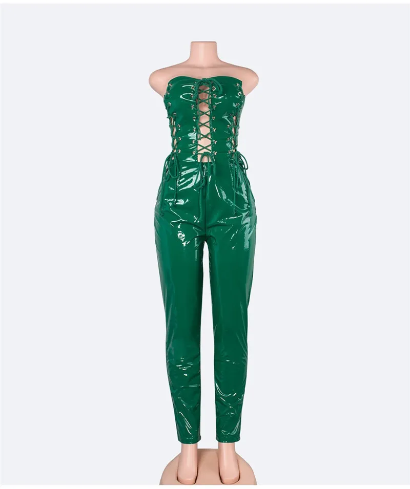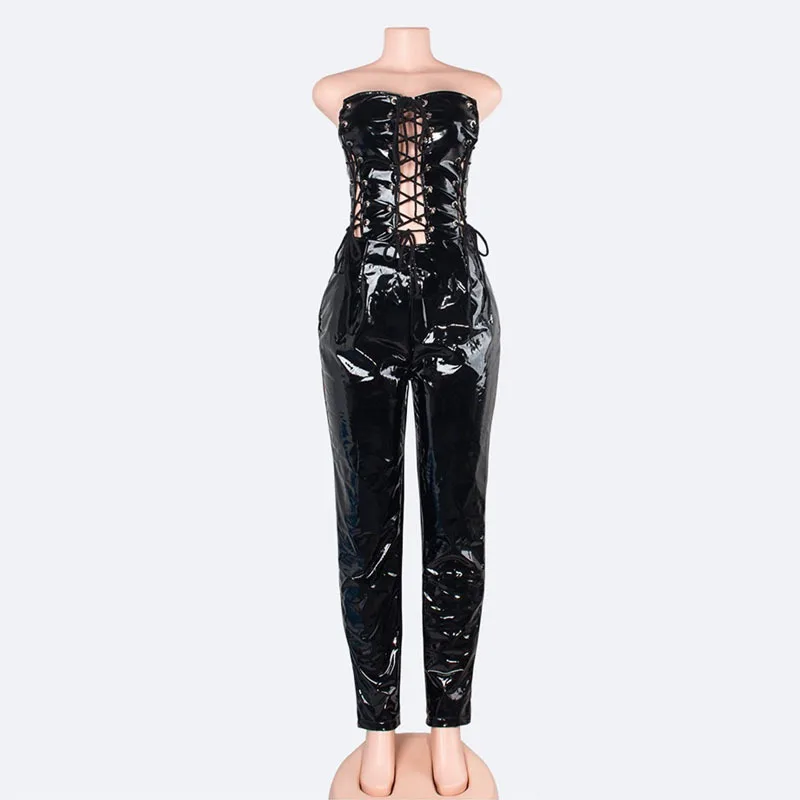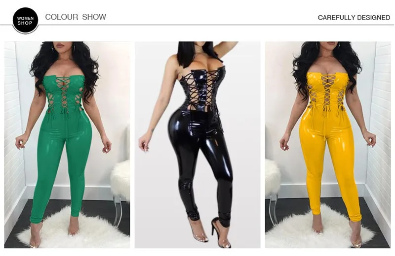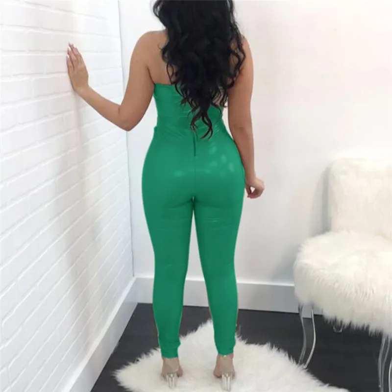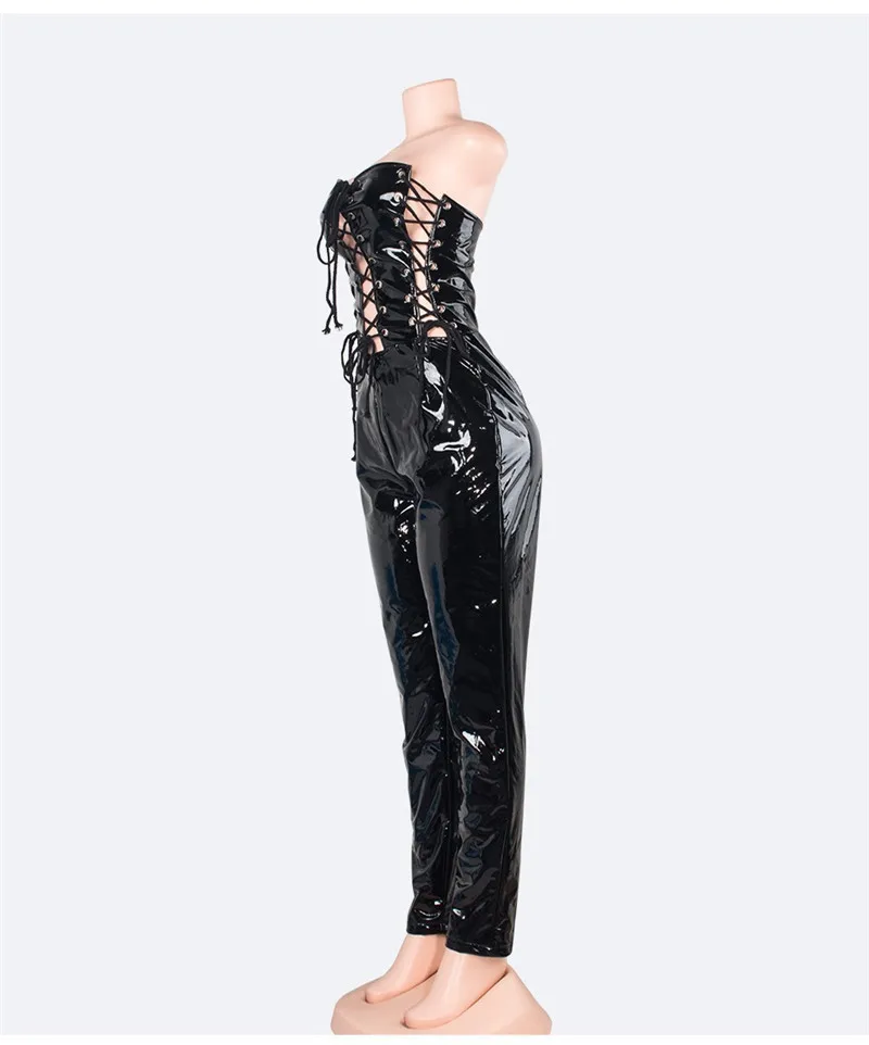 Decoration:PU Leather Rompers jumpsuit women sexy long junpsuit