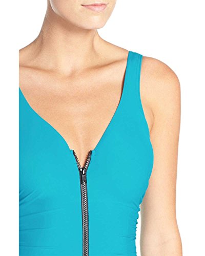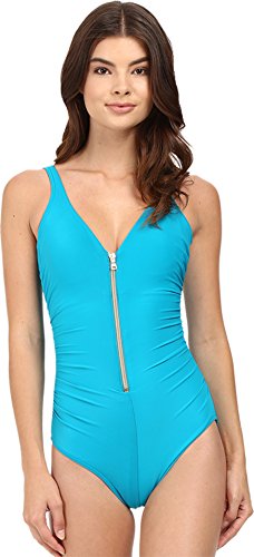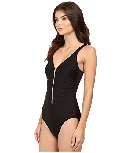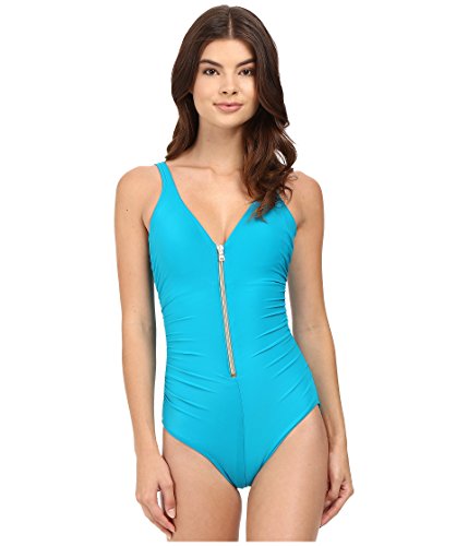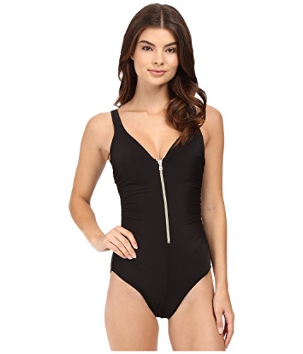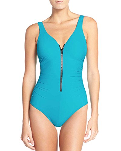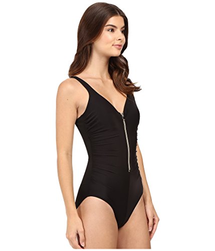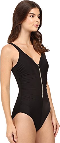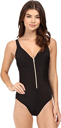 Binding : Misc. Product Description MiratexA® fabric: a€¢ Exclusive fabric is designed to provide shape without relying on constrictive inner linings and rigid panels. a€¢ Integrated, high concentration of stretch fibers provides three times the shapewear control of traditional swimwear fabrics. a€¢ 'The only swimsuit that makes you look 10 pounds lighter in 10 seconds.'a"¢ One-piece swimsuit features shirred side seams for a silhouette-flattering finish. Luxurious zipper detail down the center front. V-neckline. Scoop back. Supportive, fixed shoulder straps. Underwire shelf bra provides shape and support. Moderate cut at the leg. Full rear coverage. 69% nylon, 31% spandex; Back: 79% nylon, 21% spandex. Hand wash and line dry. Imported. If you're not fully satisfied with your purchase, you are welcome to return any unworn and unwashed items with tags intact and original packaging included. 0