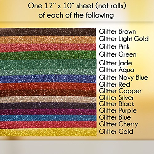- One 12” x 10” sheet (not rolls) of each of the following glitter colors: aqua, black, blue, brown, cherry, copper, gold, green, jade, light gold, navy blue, pink, purple, red, and silver