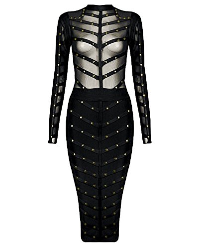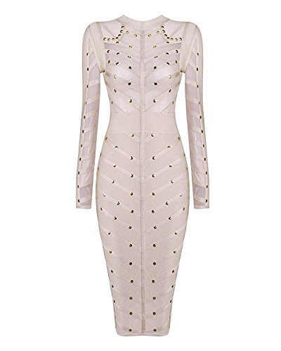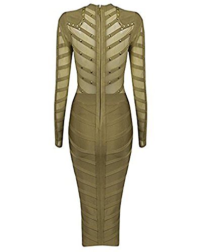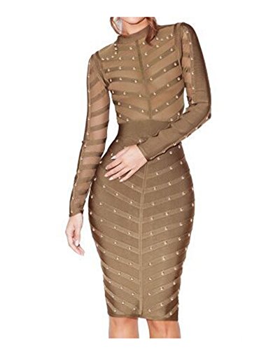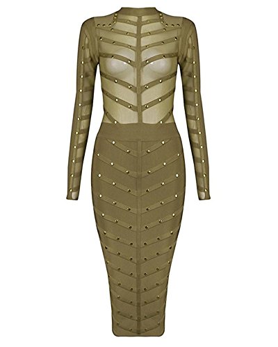 Whoinshop Women's Long Sleeve Studded Party Bandage Dress With Sheer Mesh.We adore this amazing studded creation. Crafted from our heavyweight bandage fabric and littered with golden studs, It is just amazing. In the perfect khaki colour tones,this sexy elegant dress features a sheer mesh body and sleeves. Deep waistband nips the waist over the super-flattering knee length pencil cut bandage skirt. Team yours with gold pumps.It is really a best bandage dress for a fashion women.Feature