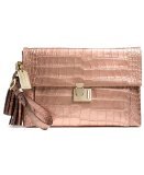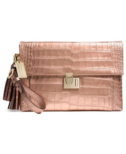 -. Feature : Done in luxurious croc embossed leather in a stunning golden color that COACH calls Rose Gold with Rose Gold hardware / Pushlock flap closure opens to reveal an interior that's fully lined in plum colored fabric with 2 individual compartments and 1 zip pocket / Adorned with a detachable wrist strap, 2 leather tassels and 1 large COACH hang tag / Approximate measurements: 11 1/2" (L) x 8 1/4" (H)
