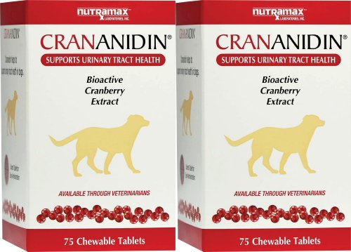 Nutramax Crananidin Chewable Tablets for Dogs 150ct (2 x 75ct) is a chewable tablet containing bioavailable cranberry extract. The cranberry extract has benn researched and is shown to support urinary tract by stopping bacteria from sticking in the urinary tract, allowing them to be flushed out in the urine.