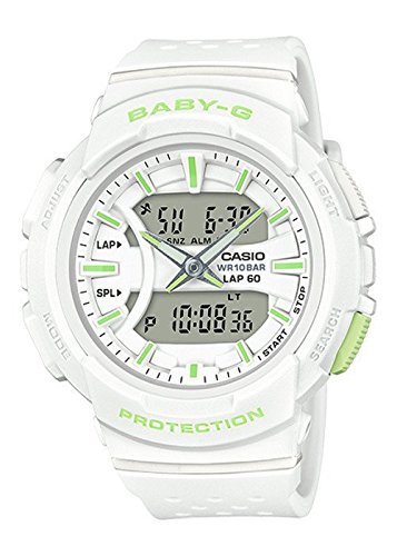 Brand, Seller, or Collection Name:Casio Part Number:BGA240-7A2 Item Shape:Round Dial window material type:Mineral Display Type:Analog/Digital Clasp:Buckle Case material:Resin Case diameter:46.4 millimeters Band Material:Resin Band Color:White Dial color:White/Lime Green Calendar:Full auto-calendar (to year 2099) Special features:Stop watch Movement:Quartz Water resistant depth:100 Meters