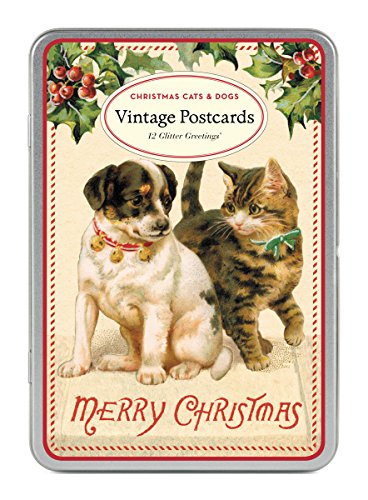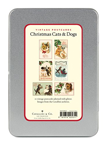 -. Title : Cavallini Papers Christmas Cats and Dogs Glitter Greetings 12 Assorted Glittered Postcards Per Tin