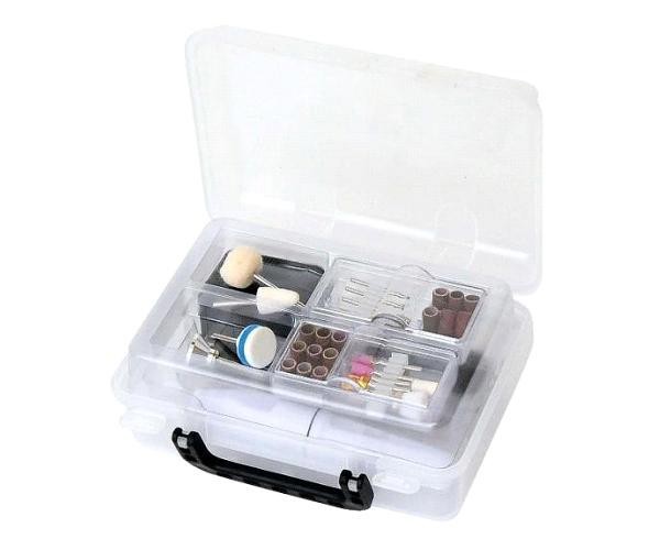 | セット内容 | ハンドル 精密軸付き砥石(傘型/台型):各1本 ダイヤモンドビット(円筒型/砲弾型/傘型/平型/丸型):各1本 カップブラシ(ナイロン):1本 フェルトバフ(円筒型/傘型/楕円型):各1本 ドラム:1本 ダイヤ円盤ヤスリ:1本 ポリッシングバフ:1本 ドラム用サンダーバンド(荒目/中目/細目):各6個 取扱説明書 保証書(6ヶ月) 収納ボックス |