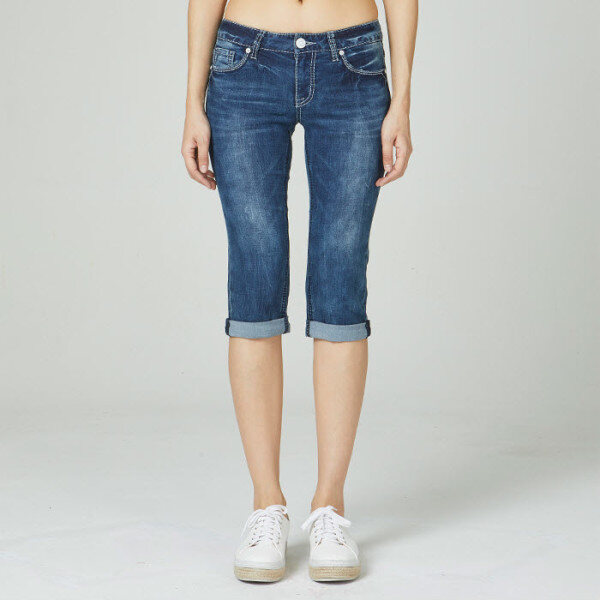 흡습성이 뛰어나 땀을 빨리 배출시켜 시원함을 느낄 수 있는 쿨맥스 소재로 전체 2올 세줄스티치 변형 포인트에 DB톤 바이오스톤 시와 얼룩이 워싱의 여성용 7부 롤업 데님스타일.