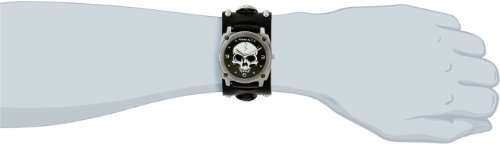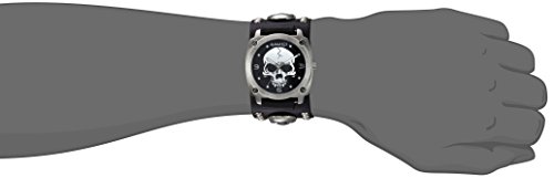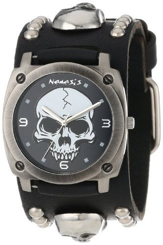 Studio : Nemesis Publisher : Nemesis Binding : Watch Product Description Nemesis Men's Punk Rock Black Heavy Duty Skull Leather Cuff Watch features silvertone case with four screws and 100% USA genuine black leather band with metals studs and iron skulls on the side. This Punk Rock Nemesis Watch also features a round glass display with white skull over black dial that has a water resistance up to 3 ATM / 30 meters / 99 feet and a Japanese quartz movement technology. 0