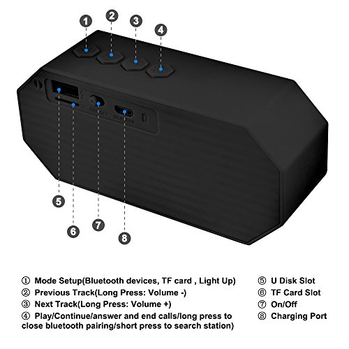 Multi-Function: bluetooth Play function/ Micro SD card and TF(up to 32G) Play Function/U Disk Play Function/Color changing LED light/ Listen to non-Bluetooth devices as a wired speaker with included 3.5mm audio cable.