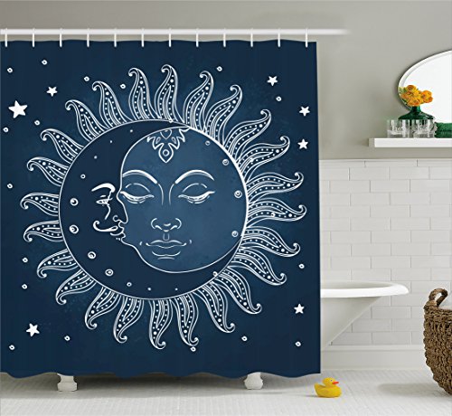 Sun and Moon Shower Curtain by Ambesonne, Spiritual Celestial Theme Sun with Crescent Moon Midnight Art, Fabric Bathroom Decor Set with Hooks, 70 Inches, Dark Blue Slate Blue White
