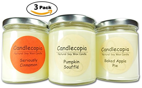 Candlecopia Pumpkin Soufflé, Baked Apple Pie and Seriously Cinnamon Strongly Scented Hand Poured Vegan Soy Candles, Dye Free, 3-Pack
