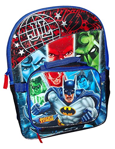 Justice league full size backpack 100 percent polyester, padded shoulder straps, one main compartment, detachable lunch bag, zipper closure, locker loop.