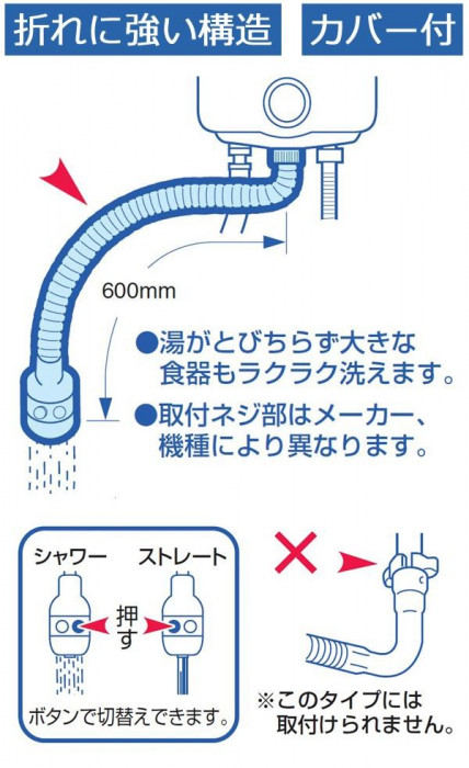 断熱カバー付。先端のシャワーでストレート・シャワー吐水に切替可能です。