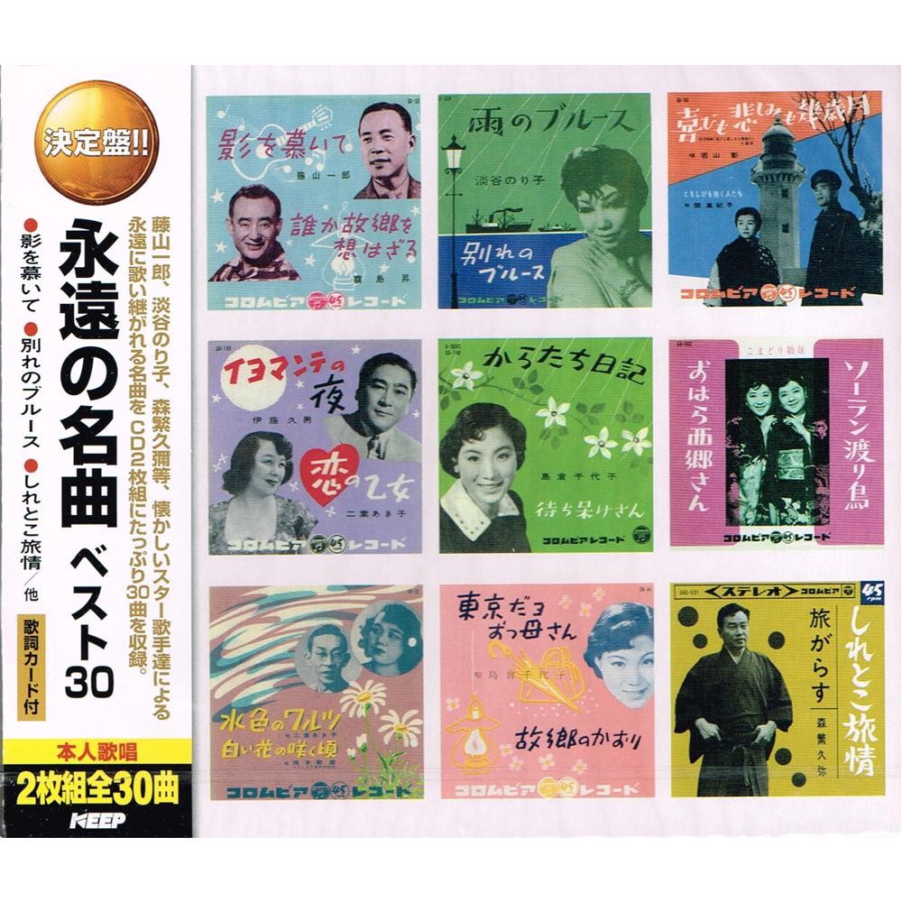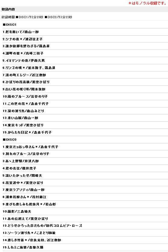 藤山一郎・淡谷のり子・森繁久彌等、懐かしいスター歌手達による永遠に歌い継がれる名曲を、CD2枚組にたっぷり30曲を収録。