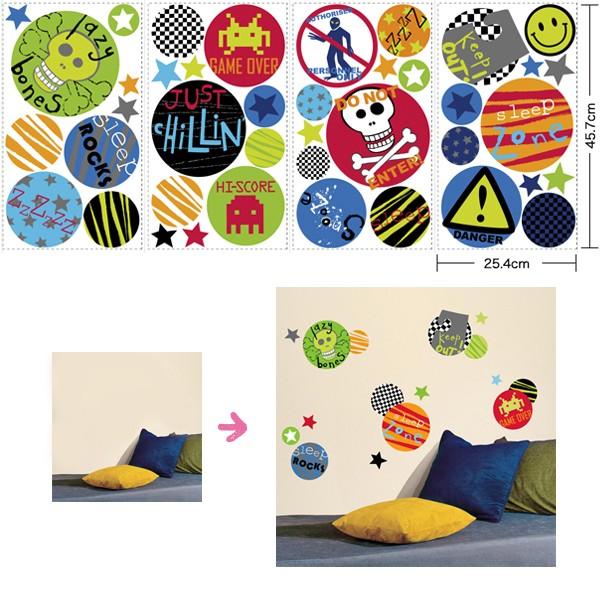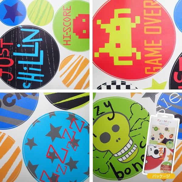 ドットの中にポップな絵や文字が描かれた楽しいステッカーです。 貼るだけで簡単に明るく楽しいお部屋になりそうですね。 使いやすい大きさのドットなので、壁紙の汚れや傷隠しにも使えそうです。こども部屋の装飾におすすめです。 ★商品名★ボーイスポット★商品番号★RMK2348SCS★シートサイズ★[45.7cm × 25.4cm]×4枚★内容★41ピース/1パック