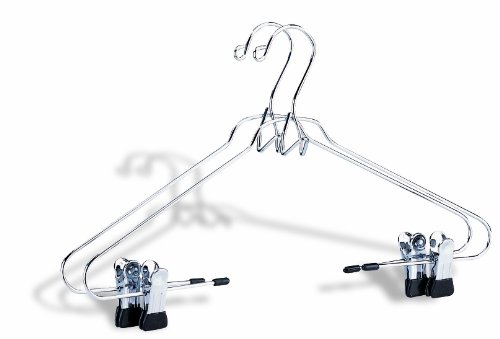 -. Feature : Set of 2 hangers / Chrome with Black Trim / 2 sturdy moveable clips for hanging pants or skirts