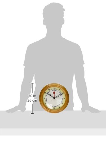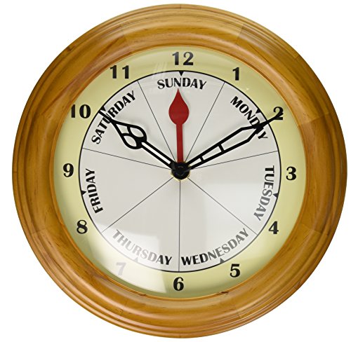 DayClock's patented design divides the face of the clock into seven equal pie shaped sections, one for each day of the week. Perfect for anyone who is fortunate enough to measure life by the day. Makes a great gift for retirees or to add a whimsical touch to vacation homes. Can be used in a child's room to help them learn the days of the week. Also very practical for persons who easily lose track of the days. This clock will look great in the office, home or RV. A smaller size than our other contemporary clocks, this contemporary oak DayClock is 9.87-inch in diameter and weighs less than a pound.Feature