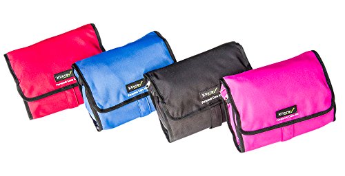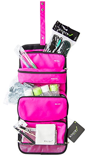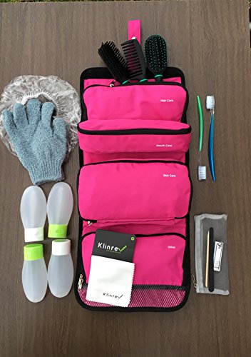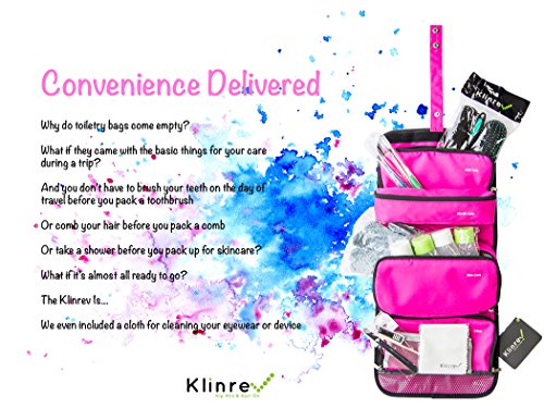 Klinrev Travel Toiletry Bag Filled with Hairbrush, 2 Toothbrushes, Exfoliating Bath Sponge, Shower cap, 4 travel size bottles, Nail care kit. Complete Personal Care Kit
